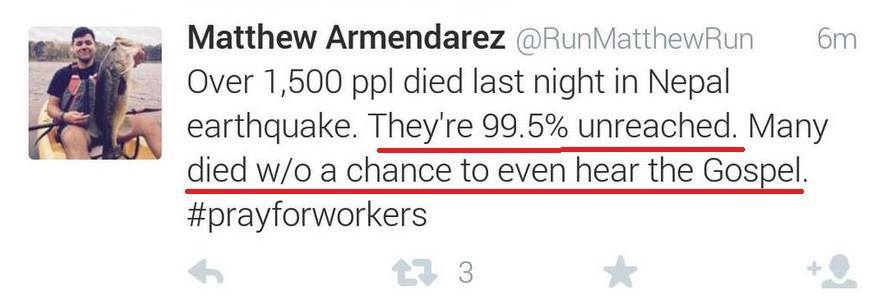 Michael Catt Twees ” Pray for believers in Nepal & India that this tragedy may provide an opportunity to show many the love of Jesus. Turning tragedy to triumph.